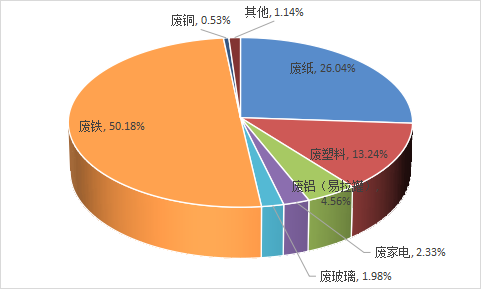 2023年,本市再生资源回收总量为39.65万吨,其中废钢铁、废塑料、废纸、废铝、废家电等主要类别的再生资源回收总量为39.2万吨,占再生资源回收总量的98.86%。2023 年再生资源主要类别回收情况见图 3。