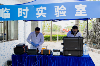 本次应急演练中,各工作组协同响应、行动迅速:应急处置组在关闭水闸的同时,调度大涌镇、横栏镇队伍同步处置——横栏镇使用吸污车转移含油废水,并采用围油栏、吸油机拦截回收进入拱北河的柴油;大涌镇则利用围油栏与吸油棉拦截磨刀门水道油污,并创新使用无人机实施投药。应急监测组采取“人工+无人机”协同采样,样品送现场指挥部临时实验室,使用便携式分光仪测定化学需氧量与石油类指标,并借助便携气相色谱-质谱联用仪分析有机物含量。应急保障组就近高效调集围油栏、吸油棉、橡皮艇等物资;供水保障组在取水口布设吸油拖栏与吸油棉,采用粉末活性炭吸附-强化混凝工艺处理,同步启用备用水源与应急供水车,全力保障居民用水安全。