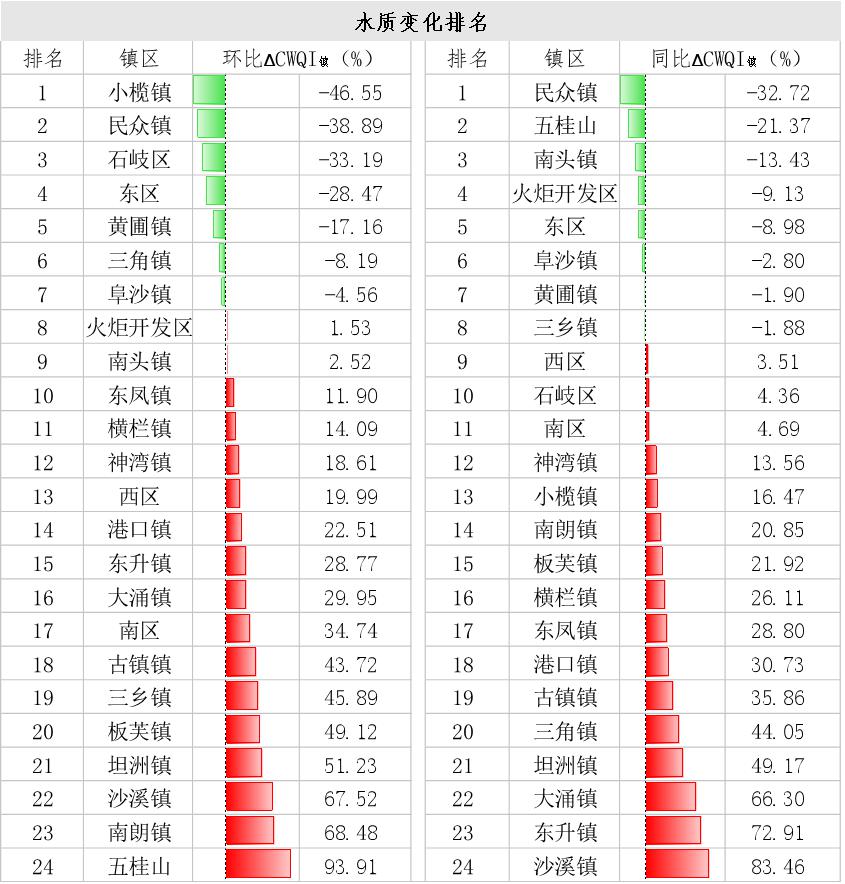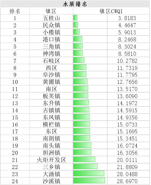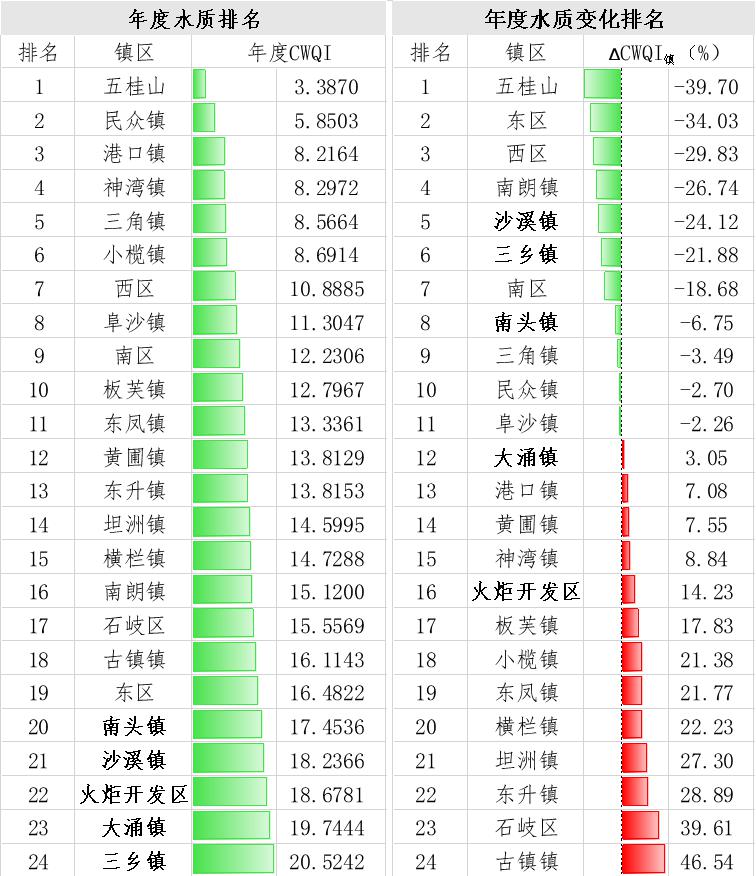 根据我市黑臭(未达标)水体整治工作部署,我局委托第三方对全市内河涌开展每季度的水质监测,现已完成2019年第四季度全市河涌水质监测工作。按照《中山市镇区水环境质量排名及信息发布工作方案(试行)》(中环〔2017〕123号)的规定,根据第四季度及全年度河涌水质检测结果,计算2019年第四季度及年度各镇区水质指数(CWQI)和水质指数变化度(△CWQI镇),按照计算结果对各镇区水环境质量状况及变化情况进行排名,现公布2019年第四季度及年度我市镇区水环境质量状况及变化情况排名: