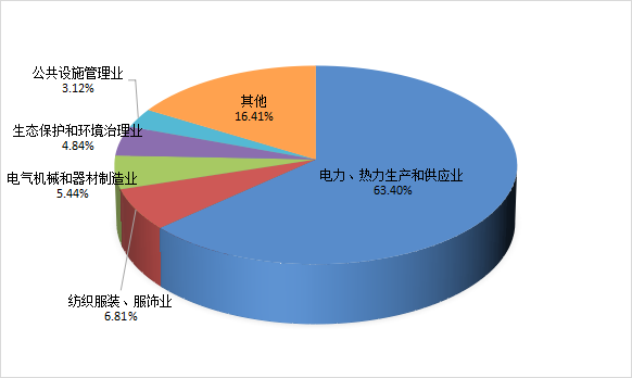 2023年,一般工业固体废物产生量排名前5的行业依次为44-电力、热力生产和供应业、18-纺织服装、服饰业、38-电气机械和器材制造业、77-生态保护和环境治理业、78-公共设施管理业,分别占全市一般工业固体废物产生量的63.40%、6.81%、5.44%、4.84%、3.12%,详细情况见图1。