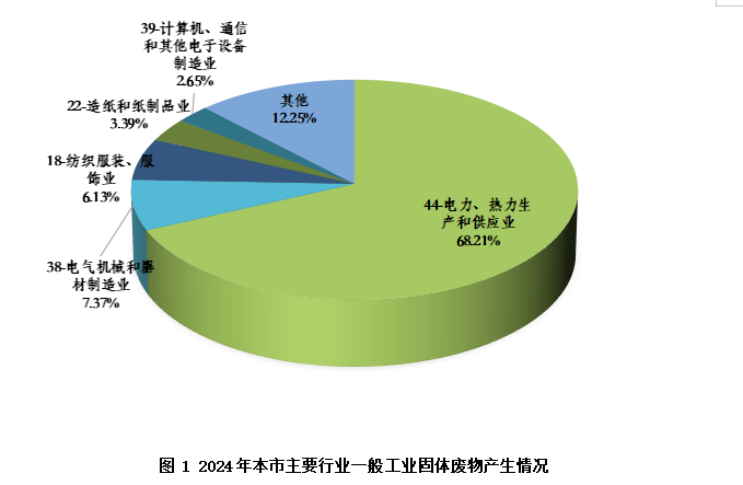 2024年,一般工业固体废物产生量排名前5的行业依次为44-电力、热力生产和供应业、38-电气机械和器材制造业、18-纺织服装、服饰业、22-造纸和纸制品业、39-计算机、通信和其他电子设备制造业,分别占全市一般工业固体废物产生量的68.21%、7.37%、6.13%、3.39%、2.65%,详细情况见图1。