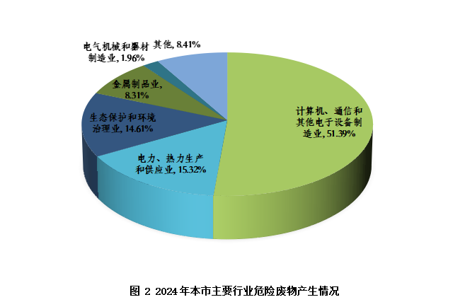2024年,本市危险废物产生量排名前五的行业依次为39-计算机、通信和其他电子设备制造业、44-电力、热力生产和供应业、77-生态保护和环境治理业、33-金属制品业、38-电气机械和器材制造业,分别占全市危险废物产生总量的51.39%、15.32%、14.61%、8.31%、1.96%,详细情况见图2。