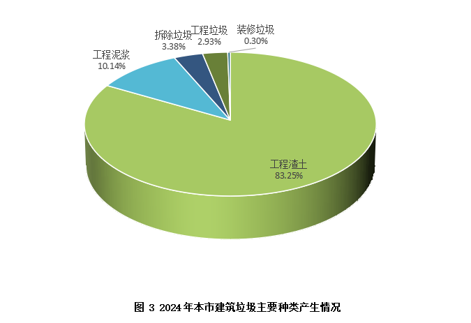 工程渣土产生量约为1511.09万吨,资源化利用量0万吨,填埋量1511.09万吨(全部回填处置);工程泥浆产生量约为184.18万吨,资源化利用量0万吨,填埋量184.18万吨(全部回填处置);工程垃圾产生量约为53.2万吨,资源化利用量53.2万吨,填埋量0万吨;拆除垃圾产生量约为61.51万吨,资源化利用量61.51万吨,填埋量0万吨;装修垃圾产生量约为5.47万吨,资源化利用量5.47万吨,填埋量0万吨。2024年建筑垃圾主要种类产生情况见图3。