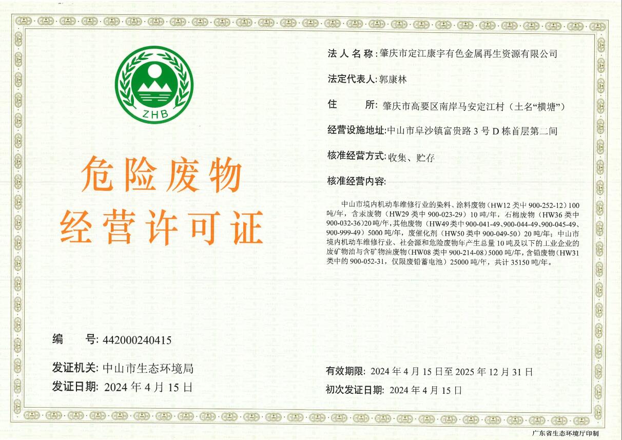 肇庆市定江康宇有色金属再生资源有限公司危险废物收集经营许可证事项审批结果