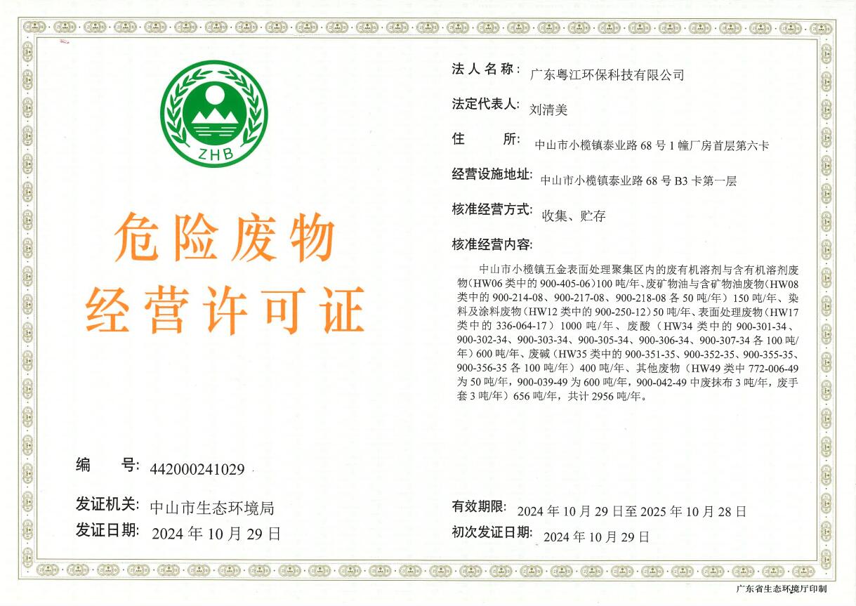 广东粤江环保科技有限公司危险废物收集经营许可证事项审批结果