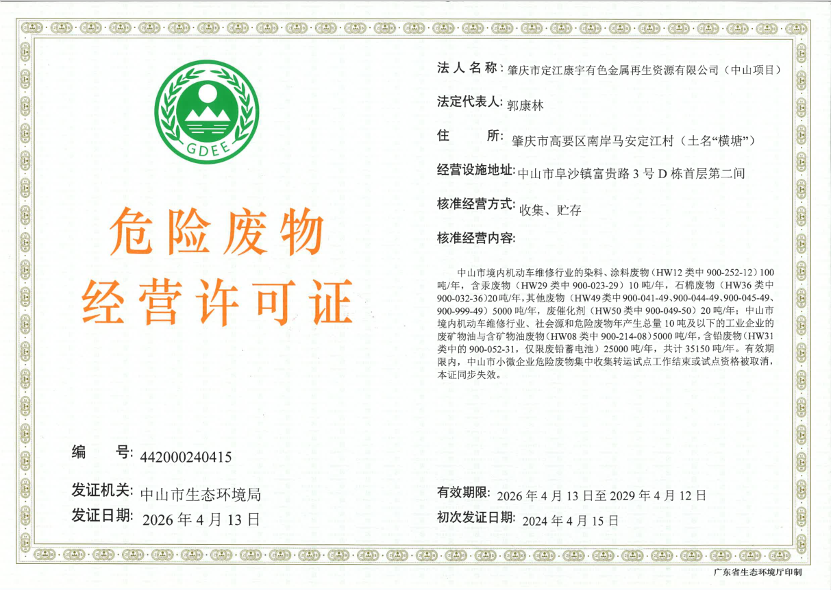 肇庆市定江康宇有色金属再生资源有限公司(中山项目)危险废物收集经营许可证审批结果