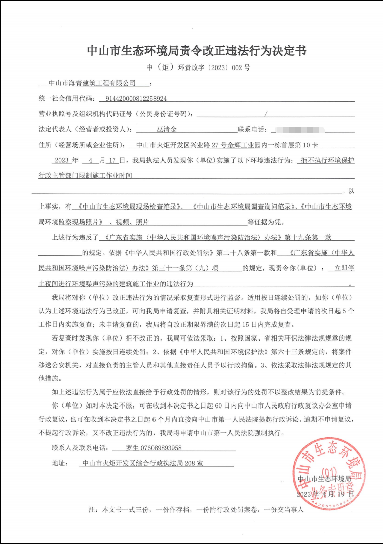 责令改正违法行为决定书全文公示(2023年4月)