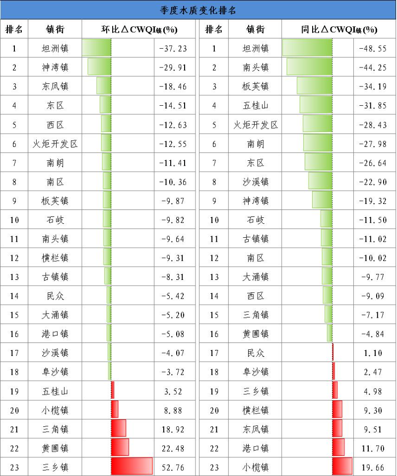 注:环比∆CWQI镇为与上一季度比较,同比∆CWQI镇为与上年同一季度比较。∆CWQI镇为负值,说明镇街地表水环境质量变好;∆CWQI镇为正值,说明镇街地表水环境质量变差。